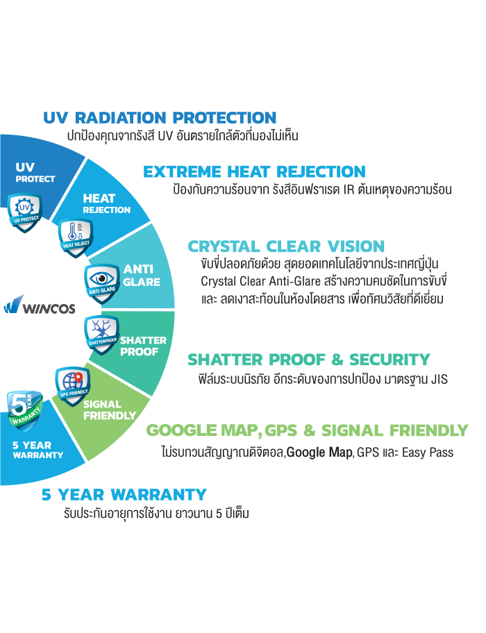 ฟิล์ม WINCOS Premium Series จาก WINCOS CLUB (Thailand) มี Nano IR Technology จากประเทศญี่ปุ่นที่ปกป้อง ให้คุณปลอดภัยจากต้นเหตุของความร้อน และอันตรายจากคลื่น รังสีอื่นๆ ที่มีอยู่ในแสงอาทิตย์ตลอดทุกความยาวคลื่น คุณภาพฟิล์มระดับพรีเมียมโดยผู้ผลิตที่ทั่วโลกให้การยอมรับจาก Lintec Corporation ประเทศญี่ปุ่นและรับรองคุณภาพในระดับสูง โดยสถาบัน JIS ( Japan Industrial Standard )